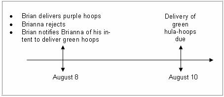 Therefore, he has until the specified delivery date of August 10 to deliver the conforming green hula-hoops.
