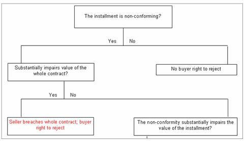 Since the non-conformity means that the rest of the plywood will be useless, the non-conformity in first carload of plywood substantially impairs the value of the whole contract for the buyer. It follows that the seller breaches the whole contract; the buyer has the right to reject the particular shipment and all future shipments, and the seller has no right to cure. The following partial flow chart captures the logical sequence of the argument.